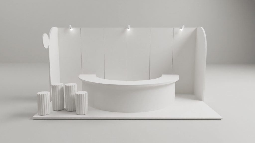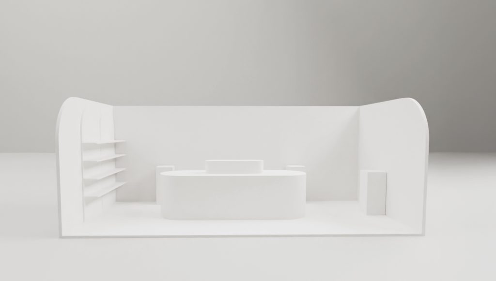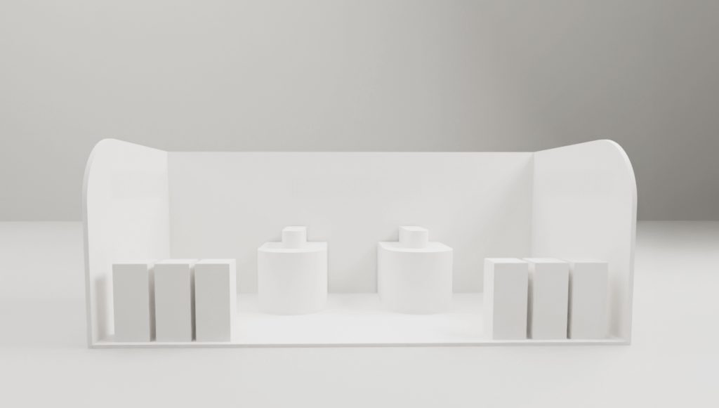 The Nesk Kit spans 6 metres in width and stands 3 metres high, making it ideal for impactful displays. It includes two Myriad Counters, each 1 metre high, with the option to add a top riser for extra height or visual emphasis. The setup also features six Square Bear plinths, each 900 millimetres high, providing versatile display surfaces to suit a range of presentation needs.
