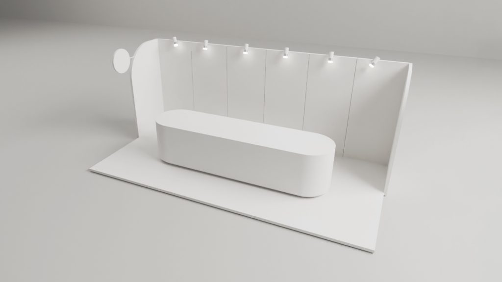 The London Kit is a 6 metre wide, 3 metre high, and 3 metre deep setup with a clean backdrop and a Myriad Ripple Counter for style and function.