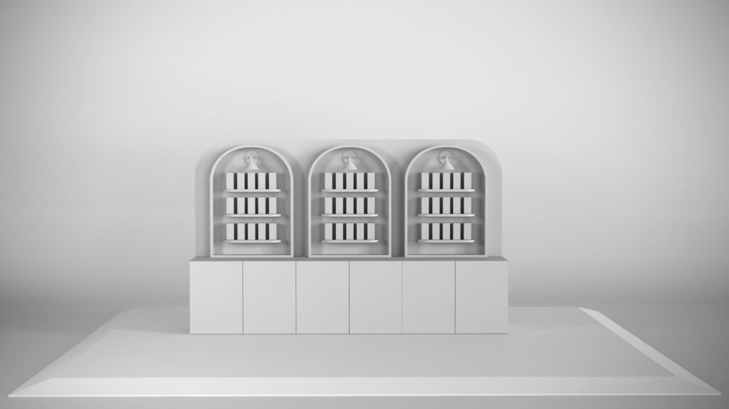 A wall display that allows you to showcase your products prominently while featuring built-in cupboards to store additional items or keep extra stock tucked away and easily accessible.