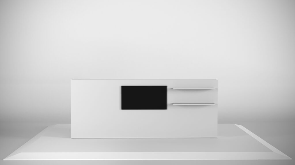 Featuring an inbuilt 40 inch TV and two floating shelves, making it ideal for showcasing digital content alongside product displays in a sleek and professional format that enhances any activation or event setup.