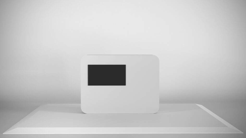 A sleek curved edge display frame with an inbuilt 40 inch TV screen and plug and play input, combining branding with digital content. Its clean, integrated design helps draw attention and elevate your presentation.