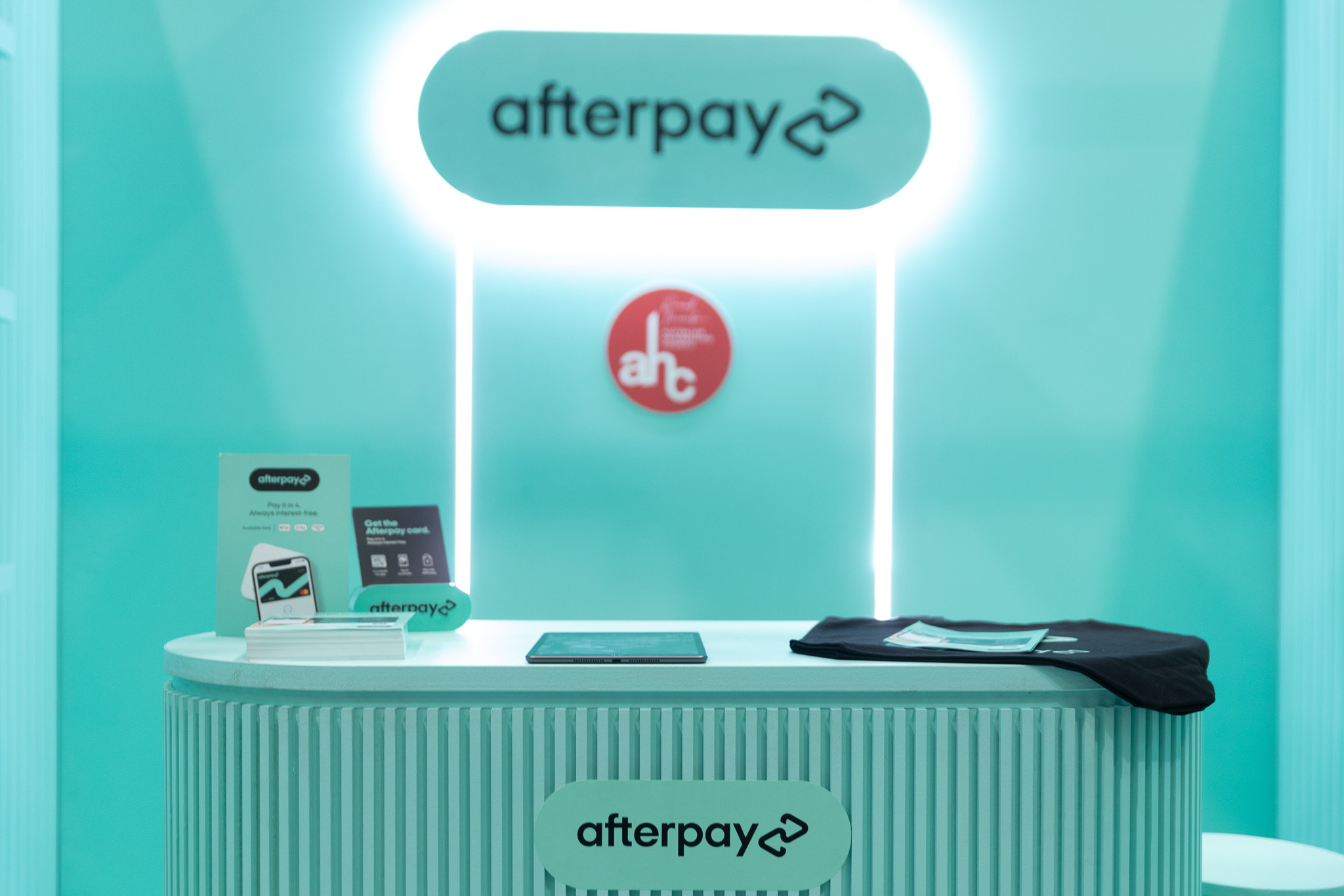 To maximise visibility within the trade hall, a suspended 3D Afterpay logo was installed above the stand, drawing attention from afar. Minimalist shelving and stools were carefully positioned to support product displays and relaxed conversations, while the open layout maintained a welcoming and accessible experience throughout the event.