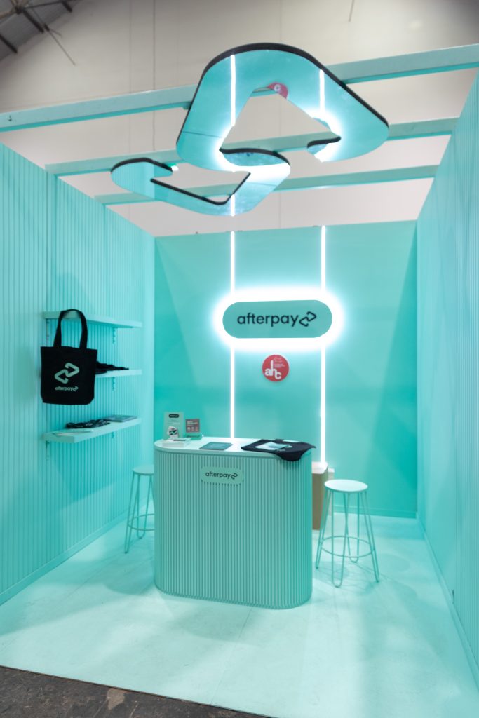 The structure featured our signature fluted panelling paired with soft, rounded forms to create a modern and approachable aesthetic. A curved front counter was designed to encourage easy interaction, supporting attendee engagement and digital demonstrations. Behind this, a sleek back wall incorporated integrated LED strip lighting and a glowing Afterpay logo, adding depth and a subtle futuristic feel that made the space highly photogenic.