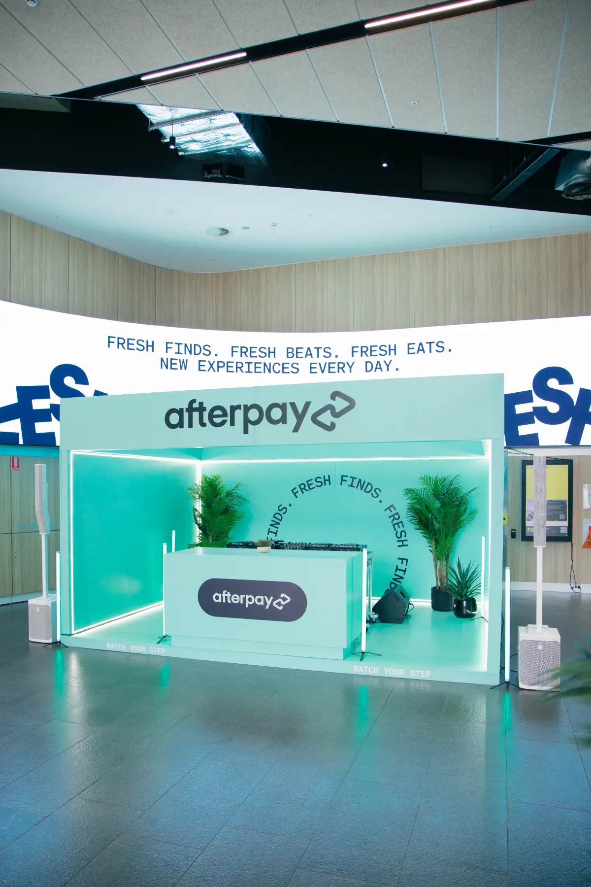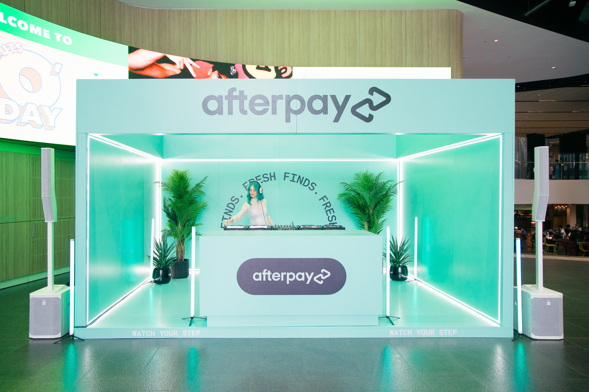 Lighting was designed to highlight the brand’s signature Bondi Mint colour while enhancing visibility and atmosphere for live performances. Acoustics were optimised to ensure DJ sets and podcasts sounded professional and clear, creating a high-quality audio experience for in-person attendees and digital audiences alike. Every detail—from the placement of equipment to the integration of greenery and LED accents—was considered to create a cohesive, engaging, and memorable environment that reflected Afterpay’s playful energy while delivering practical functionality for student engagement.