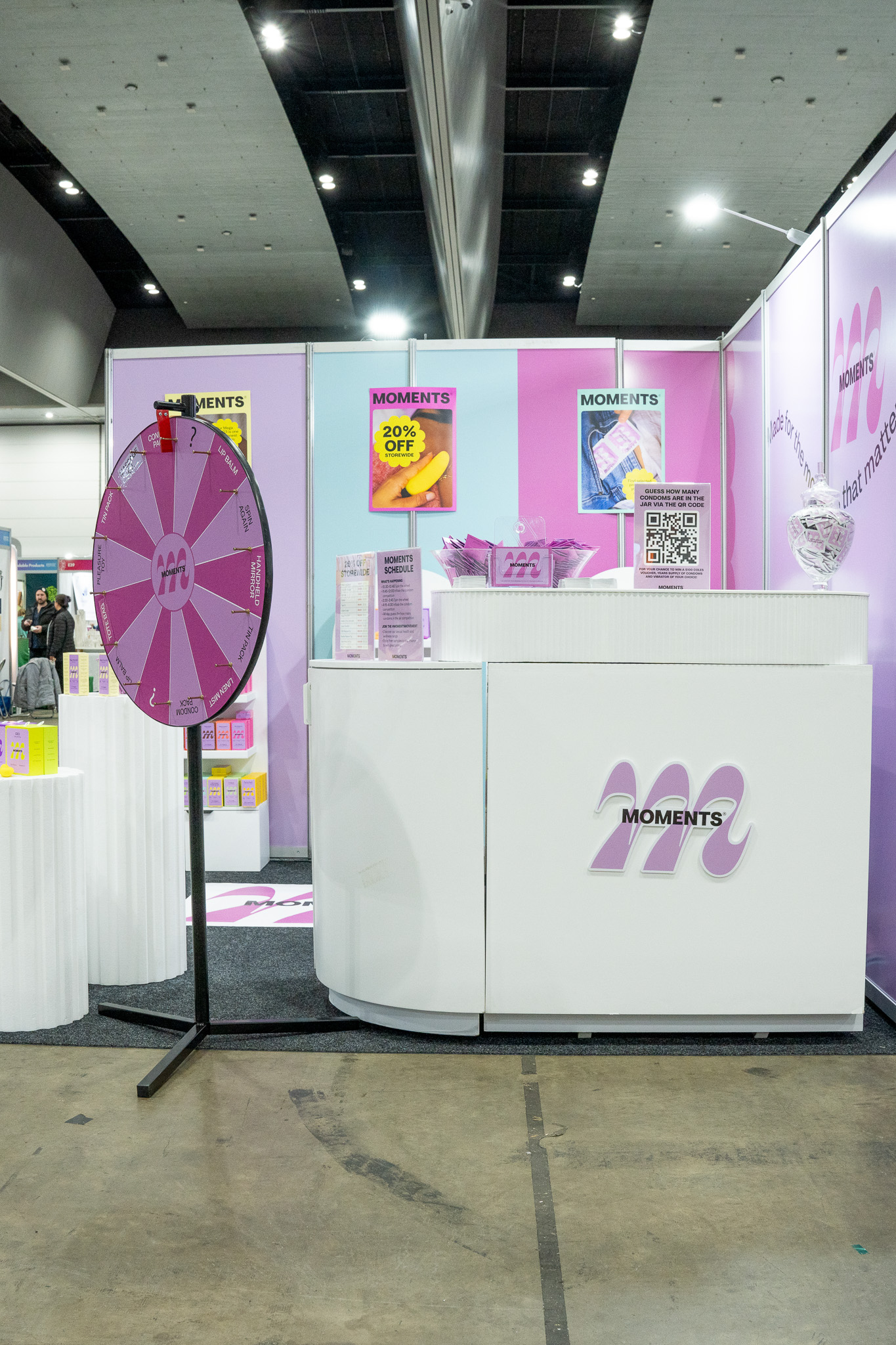 Moments Condoms aimed to make a bold and memorable impression at the Mind Body Expo while keeping within a limited budget. The objective was to highlight the brand’s playful and vibrant packaging while showcasing the full range of products in an engaging way. The stand needed to capture attention from across the expo floor, encourage visitors to explore and interact with the products, and communicate the brand’s fun and approachable personality. Functionality and visual impact were key, with a design that supported interactive elements and engagement opportunities, all achieved without the need for costly custom builds or complex installations.