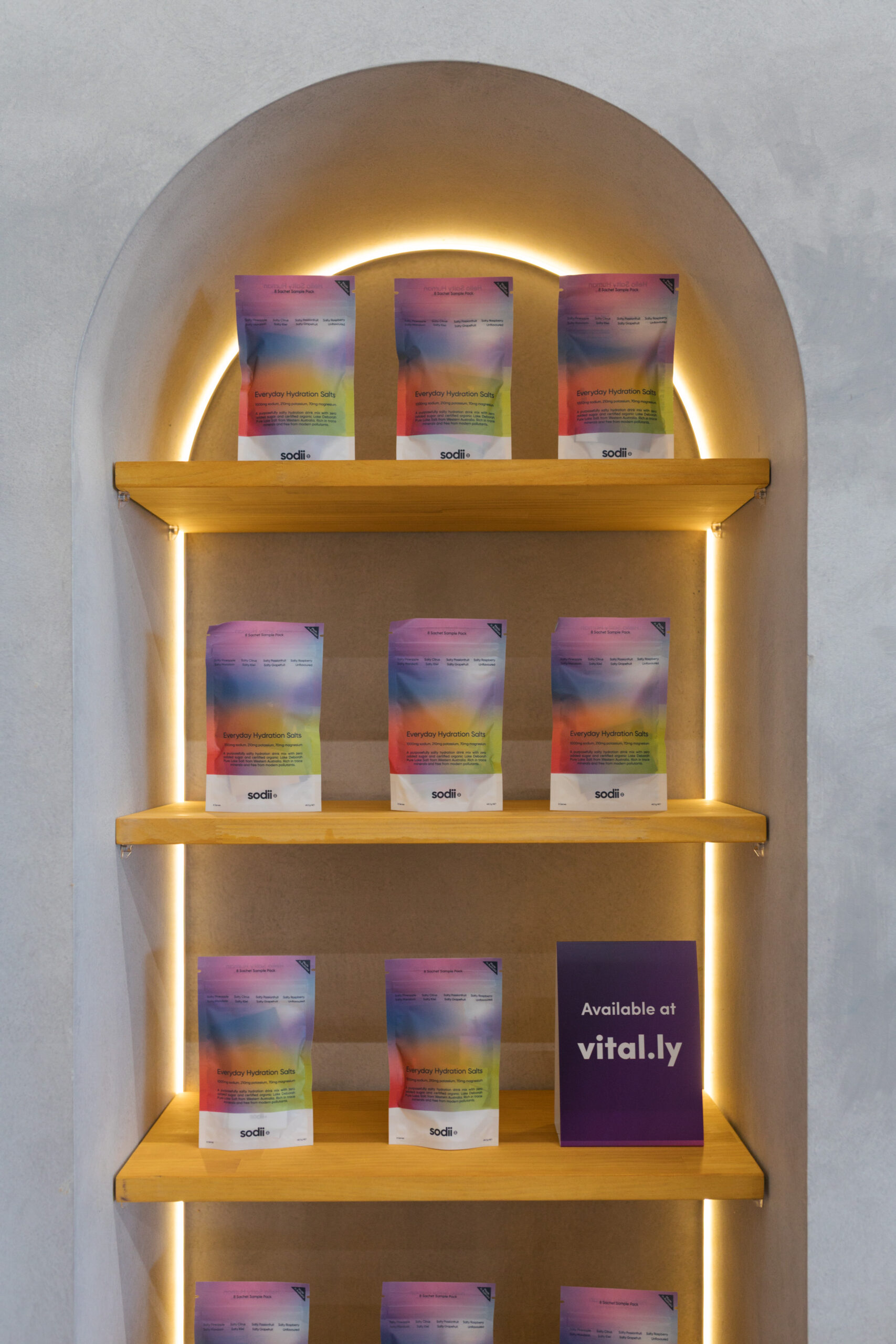 The design language of the larger 6×3 installation was carefully translated into a compact and efficient 3×3 format. Signature concrete textured finishes were applied using specialised paint techniques, adding visual depth and a premium, tactile feel that elevated the overall presentation. Bold colour blocking was incorporated to reinforce Sodii’s strong brand identity, ensuring the stand remained visually striking despite the smaller footprint. Illuminated product displays were positioned strategically to keep the product front and centre, drawing attention and highlighting its innovative design.