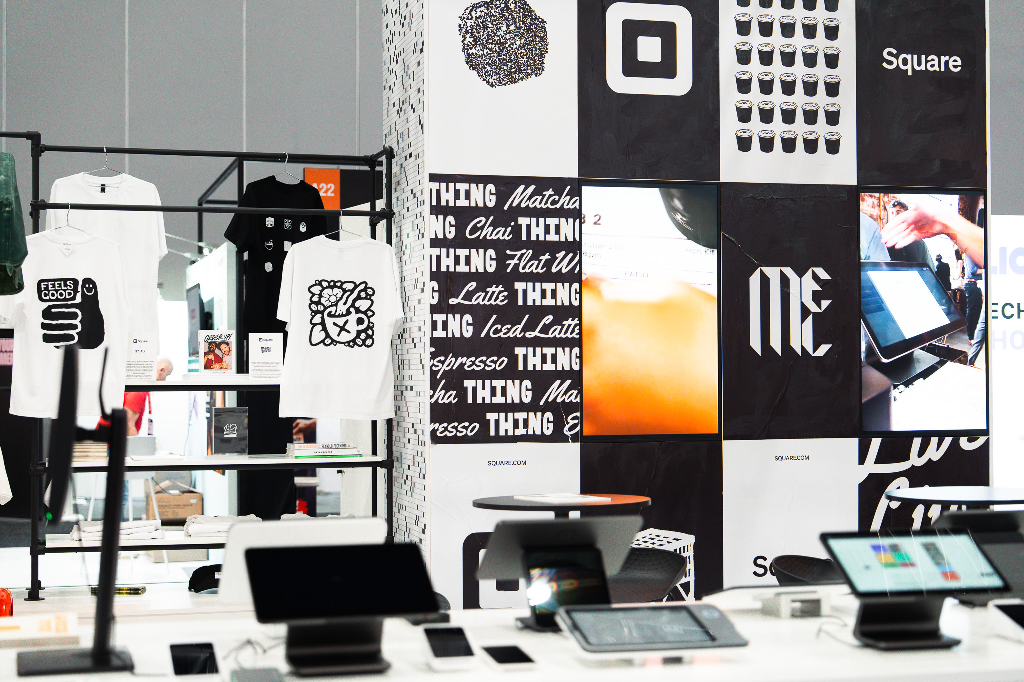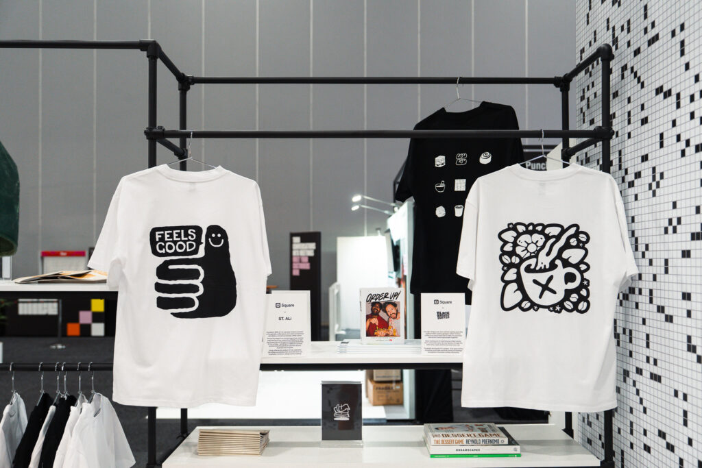 Working with the Square team, they collaborated with local coffee roasters to bring coffee culture into the space through custom t-shirts and neighbourhood-inspired caps. Every detail, from the wall and bench design to the layout, was designed to balance product engagement with social energy. The result was a stand that felt inviting, interactive, and unmistakably café-like, a space where people genuinely wanted to hang out and connect.