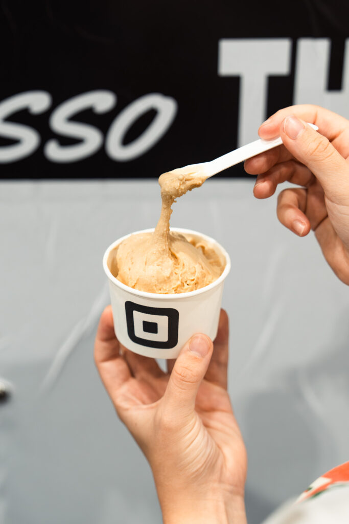 Seating areas with stools and small tables created comfortable spots for conversation, giving the space a relaxed café atmosphere. Working with the Square team, they added playful touches such as custom t-shirts in collaboration with Melbourne coffee roasters, neighbourhood-inspired caps, and free gelato served in Square-branded cups.