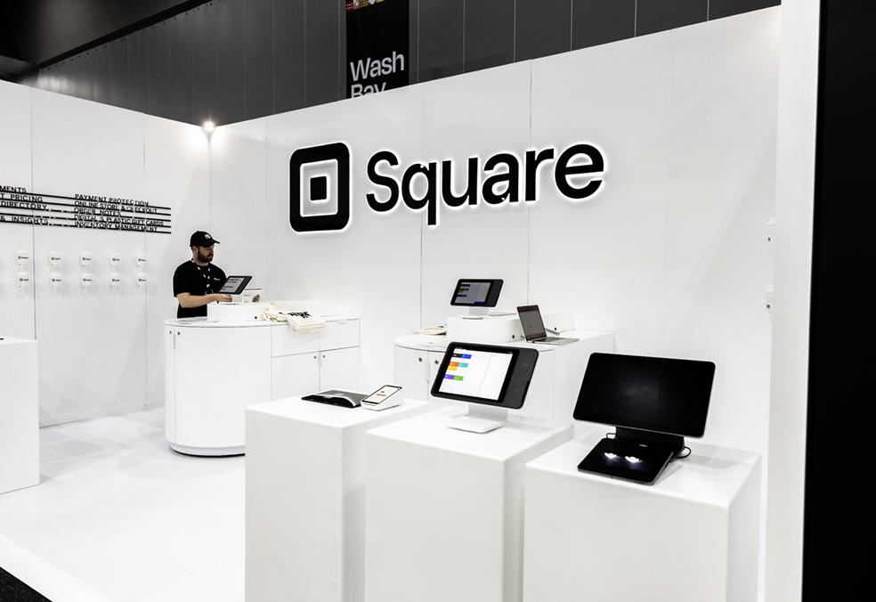 The space was designed to encourage hands-on exploration while clearly communicating Square’s value propositions. Walls were branded with Square colours, plinths displayed the hardware including Square Stand, Terminal, and Register, and tall tables were positioned for Sales team engagement.