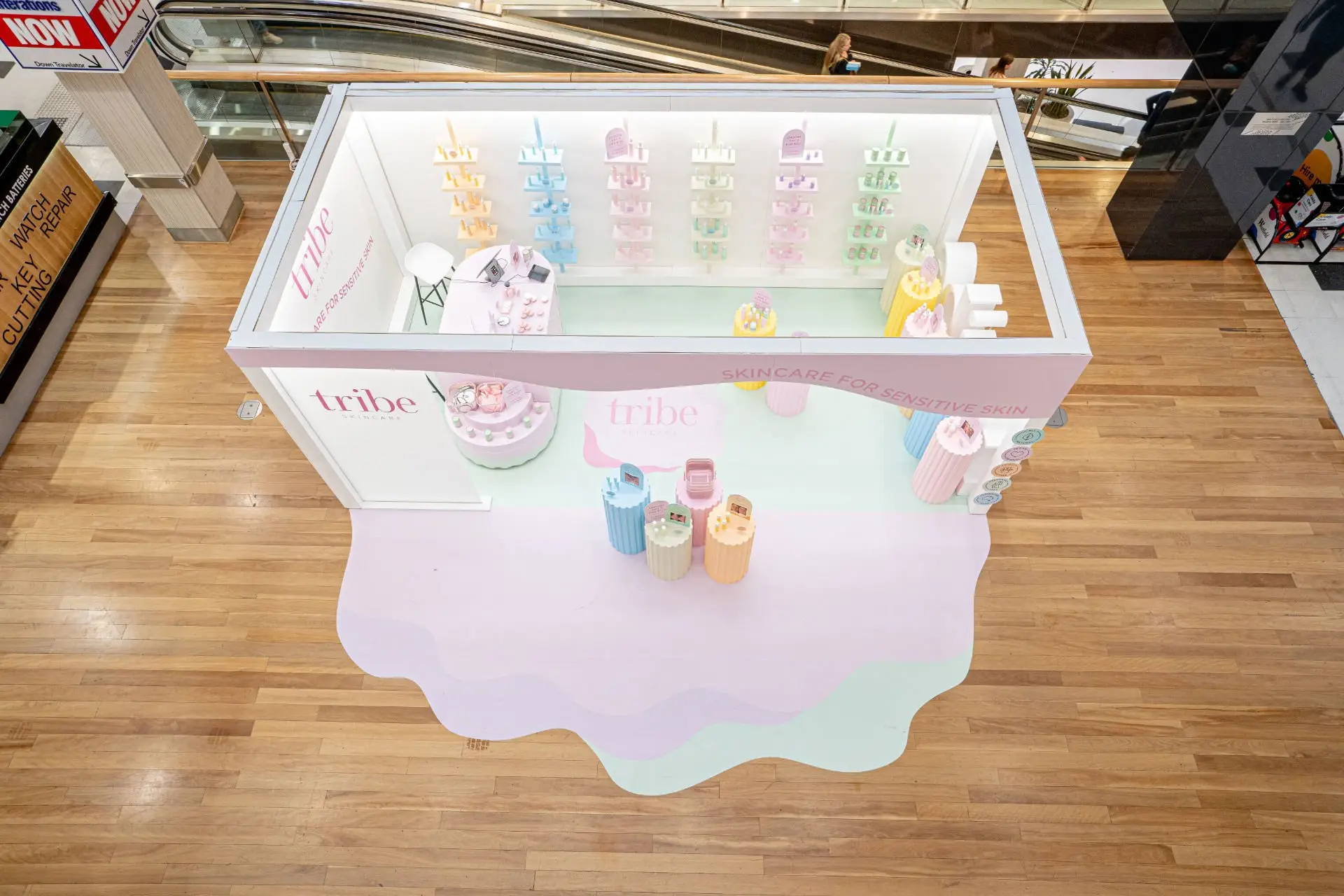 The goal was to create a pop-up at Westfield Geelong that captured the same energy and aesthetic as Tribe Skincare’s launch party while translating the brand’s playful, pastel identity into a tangible experience. They wanted a pastel paradise that highlighted their products through creative displays using different heights, making each item feel elevated and special. This retail activation would be the first time Tribe connected with customers face-to-face, providing an opportunity for engagement, discovery, and immersion in the brand world. Every detail needed to reflect the delicate, fun, and approachable nature of Tribe Skincare.